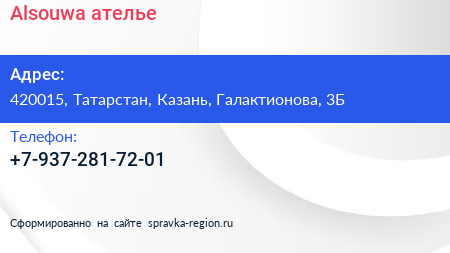 Alsouwa, ателье по адресу 420015, Татарстан, Казань, Галактионова, 3Б в дальнейшем Организация, размещена в следующих категориях: