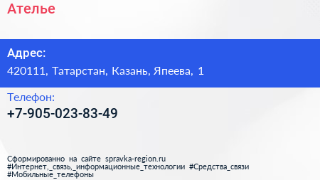 Ателье по адресу 420111, Татарстан, Казань, Япеева, 1 в дальнейшем Организация, размещена в следующих категориях:
