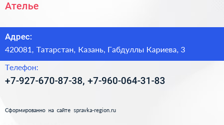 Ателье по адресу 420081, Татарстан, Казань, Габдуллы Кариева, 3 в дальнейшем Организация, размещена в следующих категориях: