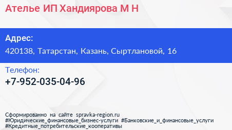 Ателье, ИП Хандиярова М.Н. по адресу 420138, Татарстан, Казань, Сыртлановой, 16 в дальнейшем Организация, размещена в следующих категориях: