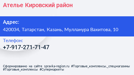 Ателье, Кировский район по адресу 420034, Татарстан, Казань, Мулланура Вахитова, 10 в дальнейшем Организация, размещена в следующих категориях:
