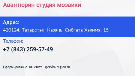 Авантюрин, студия мозаики по адресу 420124, Татарстан, Казань, Сибгата Хакима, 15 в дальнейшем Организация, размещена в следующих категориях: