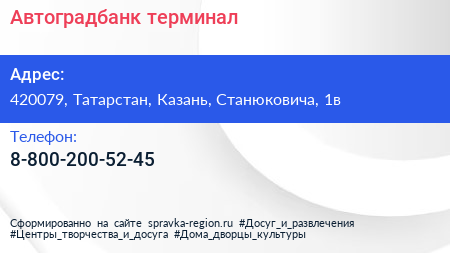 Автоградбанк, терминал по адресу 420079, Татарстан, Казань, Станюковича, 1в в дальнейшем Организация, размещена в следующих категориях: