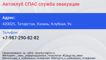 Автоклуб СПАС, служба эвакуации по адресу 420025, Татарстан, Казань, Клубная, 9а в дальнейшем Организация, размещена в следующих категориях: