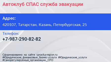 Автоклуб СПАС, служба эвакуации по адресу 420107, Татарстан, Казань, Петербургская, 25 в дальнейшем Организация, размещена в следующих категориях: