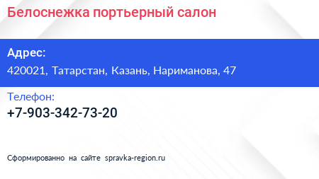 Белоснежка, портьерный салон по адресу 420021, Татарстан, Казань, Нариманова, 47 в дальнейшем Организация, размещена в следующих категориях: