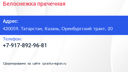 Белоснежка, прачечная по адресу 420059, Татарстан, Казань, Оренбургский тракт, 20 в дальнейшем Организация, размещена в следующих категориях: