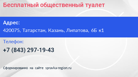 Бесплатный общественный туалет по адресу 420075, Татарстан, Казань, Липатова, 6Б к1 в дальнейшем Организация, размещена в следующих категориях: