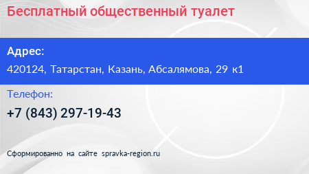 Бесплатный общественный туалет по адресу 420124, Татарстан, Казань, Абсалямова, 29 к1 в дальнейшем Организация, размещена в следующих категориях: