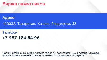 Биржа памятников по адресу 420032, Татарстан, Казань, Гладилова, 53 в дальнейшем Организация, размещена в следующих категориях:
