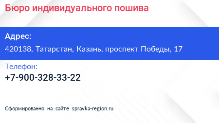 Бюро индивидуального пошива по адресу 420138, Татарстан, Казань, проспект Победы, 17 в дальнейшем Организация, размещена в следующих категориях: