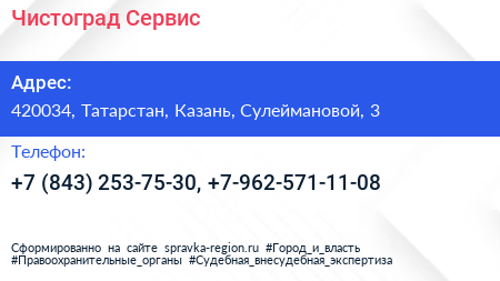 Чистоград-Сервис по адресу 420034, Татарстан, Казань, Сулеймановой, 3 в дальнейшем Организация, размещена в следующих категориях: