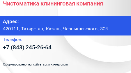 Чистоматика, клининговая компания по адресу 420111, Татарстан, Казань, Чернышевского, 30Б в дальнейшем Организация, размещена в следующих категориях: