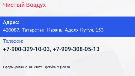 Чистый Воздух по адресу 420087, Татарстан, Казань, Аделя Кутуя, 153 в дальнейшем Организация, размещена в следующих категориях: