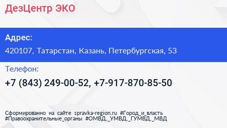 ДезЦентр ЭКО по адресу 420107, Татарстан, Казань, Петербургская, 53 в дальнейшем Организация, размещена в следующих категориях: