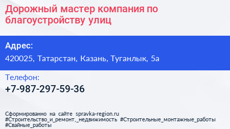 Дорожный мастер, компания по благоустройству улиц по адресу 420025, Татарстан, Казань, Туганлык, 5а в дальнейшем Организация, размещена в следующих категориях: