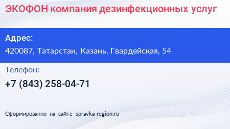 ЭКОФОН, компания дезинфекционных услуг по адресу 420087, Татарстан, Казань, Гвардейская, 54 в дальнейшем Организация, размещена в следующих категориях: