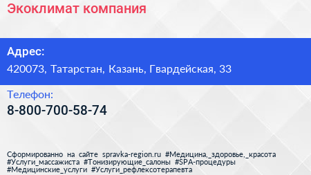 Экоклимат, компания по адресу 420073, Татарстан, Казань, Гвардейская, 33 в дальнейшем Организация, размещена в следующих категориях: