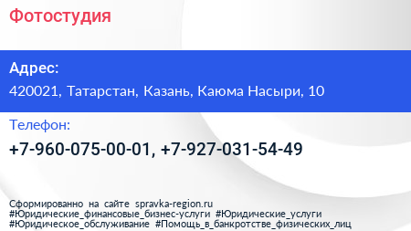 Фотостудия по адресу 420021, Татарстан, Казань, Каюма Насыри, 10 в дальнейшем Организация, размещена в следующих категориях: