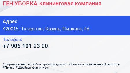 ГЕН.УБОРКА, клининговая компания по адресу 420015, Татарстан, Казань, Пушкина, 46 в дальнейшем Организация, размещена в следующих категориях: