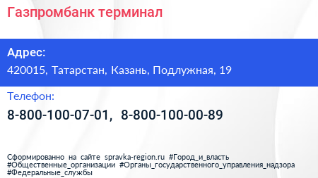 Газпромбанк, терминал по адресу 420015, Татарстан, Казань, Подлужная, 19 в дальнейшем Организация, размещена в следующих категориях: