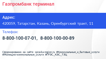 Газпромбанк, терминал по адресу 420059, Татарстан, Казань, Оренбургский тракт, 11 в дальнейшем Организация, размещена в следующих категориях: