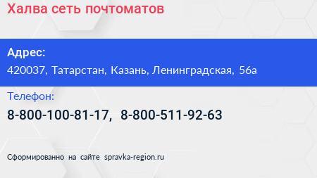 Халва, сеть почтоматов по адресу 420037, Татарстан, Казань, Ленинградская, 56а в дальнейшем Организация, размещена в следующих категориях: