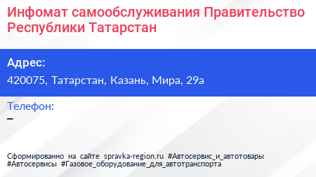 Инфомат самообслуживания, Правительство Республики Татарстан по адресу 420075, Татарстан, Казань, Мира, 29а в дальнейшем Организация, размещена в следующих категориях:
