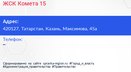 ЖСК Комета-15 по адресу 420127, Татарстан, Казань, Максимова, 45а в дальнейшем Организация, размещена в следующих категориях: