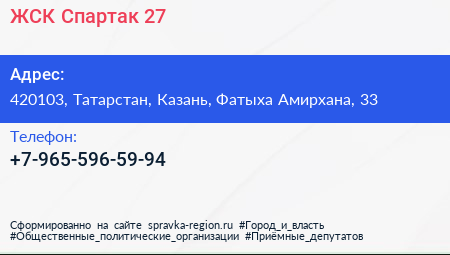 ЖСК Спартак-27 по адресу 420103, Татарстан, Казань, Фатыха Амирхана, 33 в дальнейшем Организация, размещена в следующих категориях: