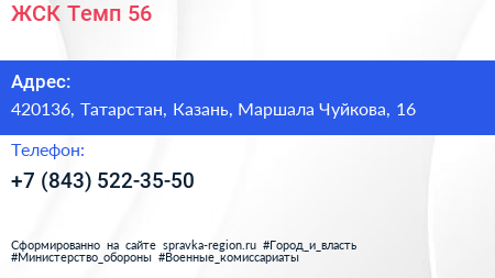 ЖСК Темп 56 по адресу 420136, Татарстан, Казань, Маршала Чуйкова, 16 в дальнейшем Организация, размещена в следующих категориях: