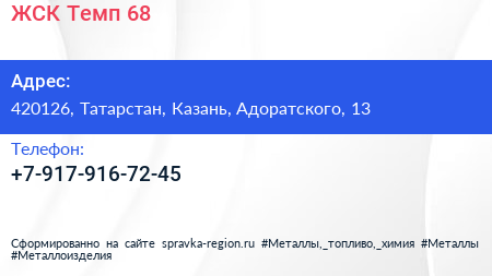 ЖСК Темп-68 по адресу 420126, Татарстан, Казань, Адоратского, 13 в дальнейшем Организация, размещена в следующих категориях: