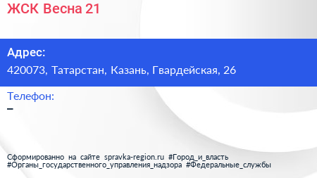 ЖСК Весна-21 по адресу 420073, Татарстан, Казань, Гвардейская, 26 в дальнейшем Организация, размещена в следующих категориях: