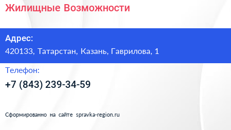 Жилищные Возможности по адресу 420133, Татарстан, Казань, Гаврилова, 1 в дальнейшем Организация, размещена в следующих категориях: