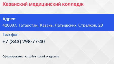 Казанский медицинский колледж по адресу 420087, Татарстан, Казань, Латышских Стрелков, 23 в дальнейшем Организация, размещена в следующих категориях: