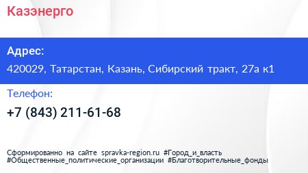 Казэнерго по адресу 420029, Татарстан, Казань, Сибирский тракт, 27а к1 в дальнейшем Организация, размещена в следующих категориях:
