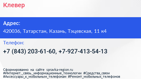 Клевер по адресу 420036, Татарстан, Казань, Тэцевская, 11 к4 в дальнейшем Организация, размещена в следующих категориях: