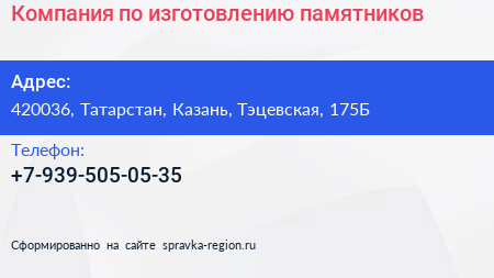 Компания по изготовлению памятников по адресу 420036, Татарстан, Казань, Тэцевская, 175Б в дальнейшем Организация, размещена в следующих категориях: