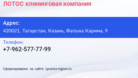 ЛОТОС, клининговая компания по адресу 420021, Татарстан, Казань, Фатыха Карима, 9 в дальнейшем Организация, размещена в следующих категориях: