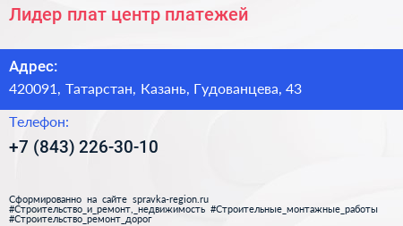 Лидер-плат, центр платежей по адресу 420091, Татарстан, Казань, Гудованцева, 43 в дальнейшем Организация, размещена в следующих категориях: