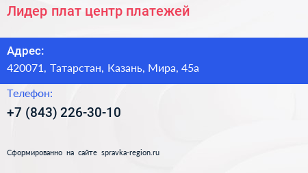 Лидер-плат, центр платежей по адресу 420071, Татарстан, Казань, Мира, 45а в дальнейшем Организация, размещена в следующих категориях: