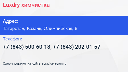 Luxdry, химчистка по адресу Татарстан, Казань, Олимпийская, 8 в дальнейшем Организация, размещена в следующих категориях: