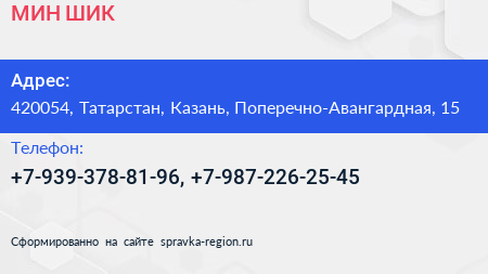 МИН-ШИК по адресу 420054, Татарстан, Казань, Поперечно-Авангардная, 15 в дальнейшем Организация, размещена в следующих категориях: