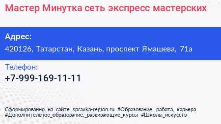 Мастер Минутка, сеть экспресс-мастерских по адресу 420126, Татарстан, Казань, проспект Ямашева, 71а в дальнейшем Организация, размещена в следующих категориях: