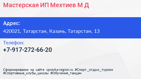 Мастерская, ИП Мехтиев М.Д. по адресу 420021, Татарстан, Казань, Татарстан, 13 в дальнейшем Организация, размещена в следующих категориях: