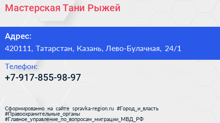 Мастерская Тани Рыжей по адресу 420111, Татарстан, Казань, Лево-Булачная, 24/1 в дальнейшем Организация, размещена в следующих категориях: