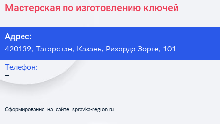 Мастерская по изготовлению ключей по адресу 420139, Татарстан, Казань, Рихарда Зорге, 101 в дальнейшем Организация, размещена в следующих категориях: