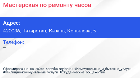 Мастерская по ремонту часов по адресу 420036, Татарстан, Казань, Копылова, 5 в дальнейшем Организация, размещена в следующих категориях:
