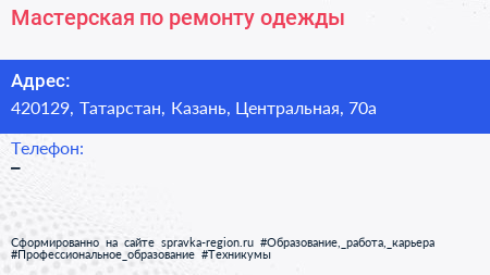 Мастерская по ремонту одежды по адресу 420129, Татарстан, Казань, Центральная, 70а в дальнейшем Организация, размещена в следующих категориях: