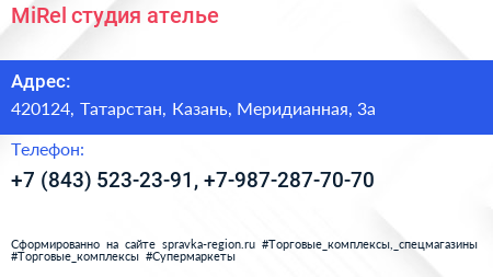 MiRel, студия-ателье по адресу 420124, Татарстан, Казань, Меридианная, 3а в дальнейшем Организация, размещена в следующих категориях: